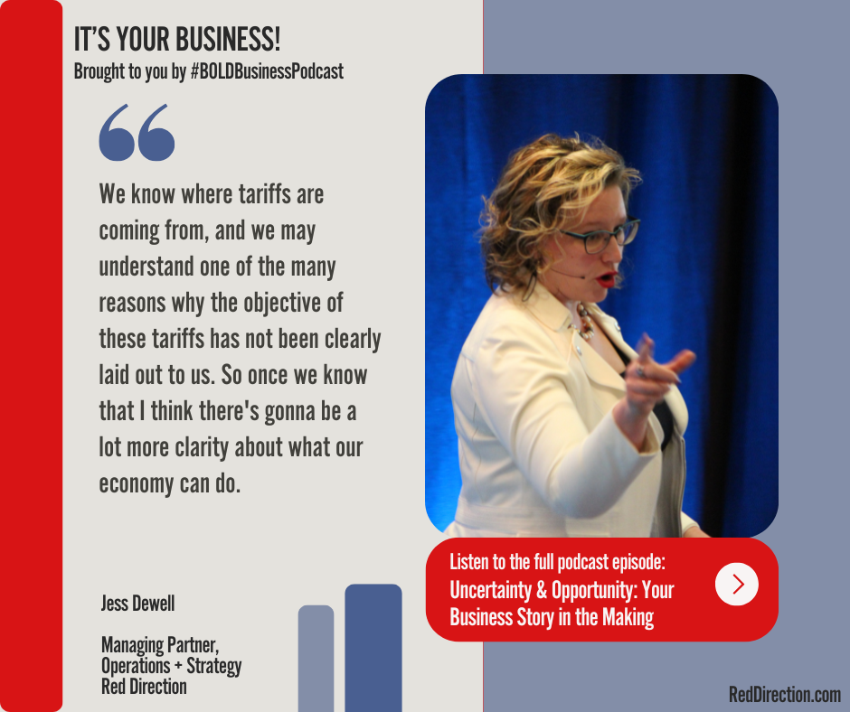 Christy Maxfield, President and CEO at Purpose First Advisors, Dean Barta, Founder and CEO at Barta Business Group, and your host, Jess Dewell, Managing Partner and Growth Strategist at Red Direction, discuss what makes it BOLD to claim your company’s narrative as you navigate uncertainty and opportunity.